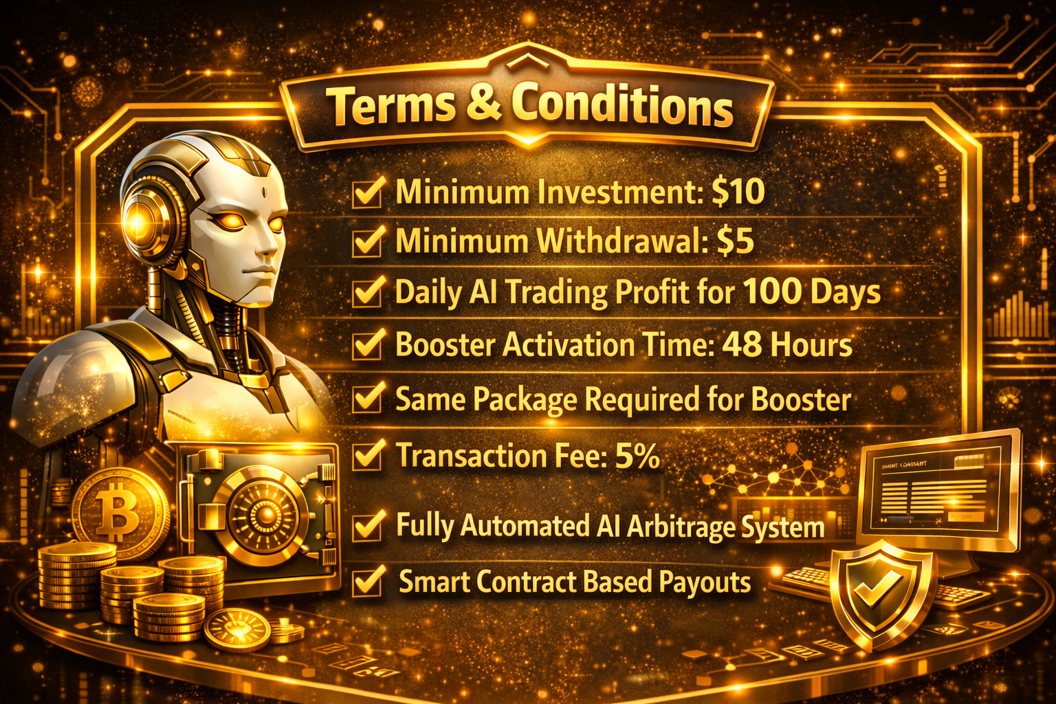 Our vision is to become a globally trusted decentralized trading platform that seamlessly integrates Artificial Intelligence with blockchain technology. We seek to redefine how individuals participate in digital financial markets by providing fair access, predictable automation, and long-term value creation without reliance on centralized authorities.